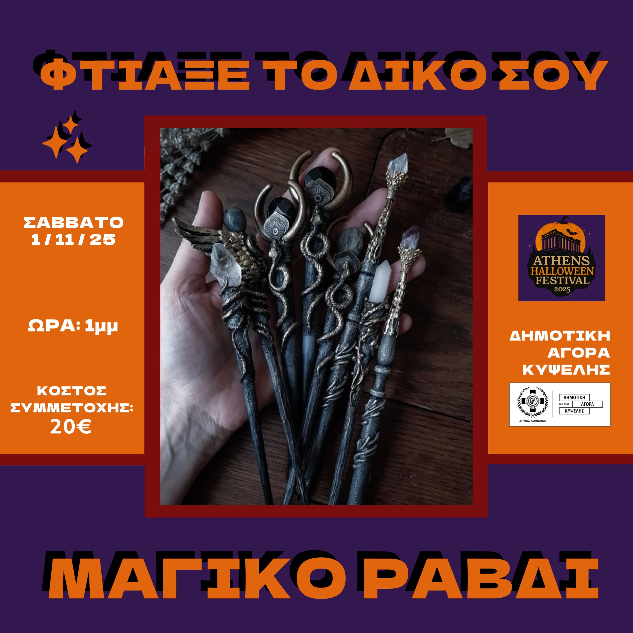 Με οδηγίες βήμα-βήμα από τις μάγισσες του Athens Halloween Festival θα διαμορφώσεις το ραβδί σου με υλικά, θα το στολίσεις με κρυστάλλους, σύμβολα και σχέδια που αντικατοπτρίζουν τη δική σου προσωπικότητα!