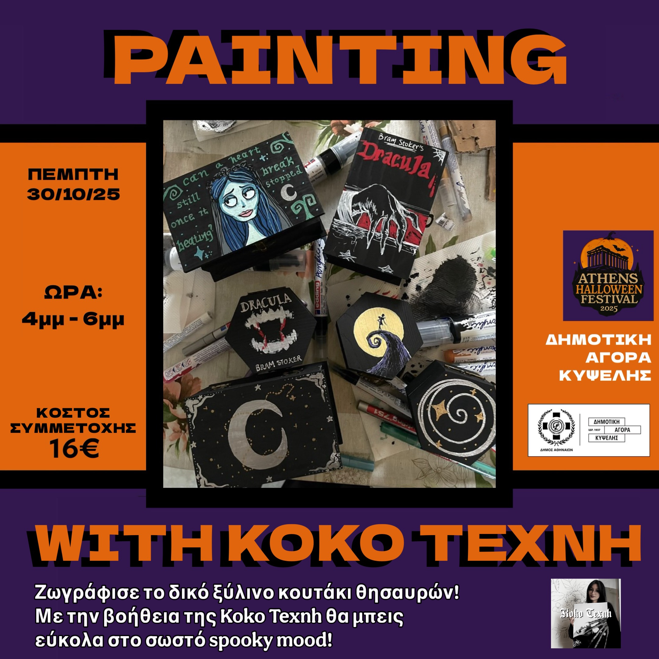Με καθοδήγηση από την Koko Τέχνη, θα δημιουργήσεις ένα μοναδικό ξύλινο κουτί, ζωγραφισμένο από εσένα, εμπνευσμένο από Halloween και σκοτεινούς ήρωες!